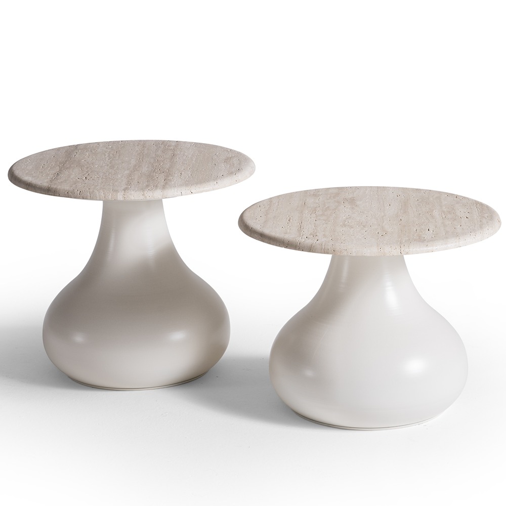 Dimensions (big table): Diameter: 63cm Height: 50cm, Dimensions (small table): Diameter: 62cm Height: 45cm,