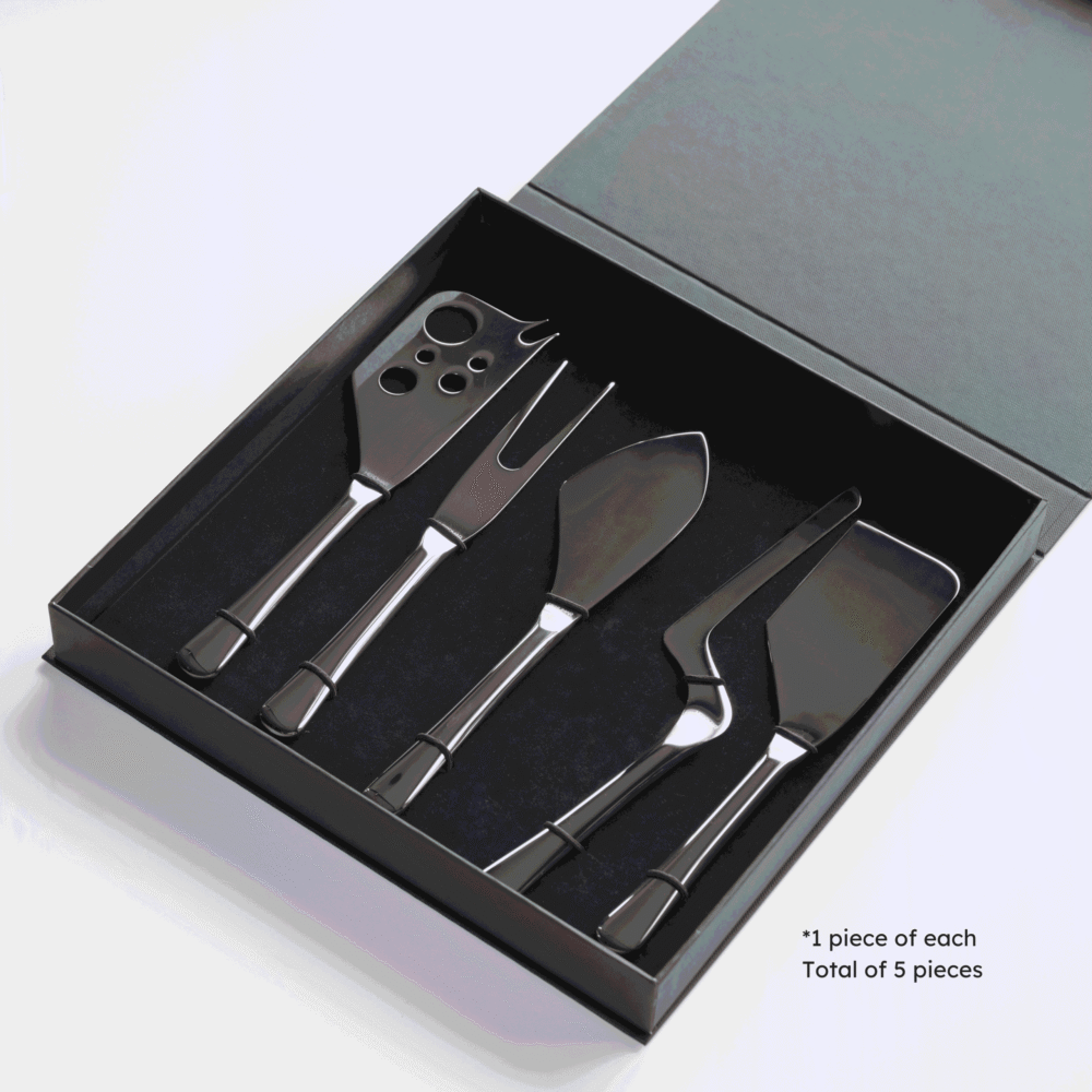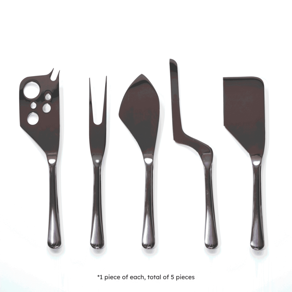 Set includes: 1 cheese fork, 1 cheese soft knife, 1 cheese mid-soft knife, 1 cheese mid-hard knife, 1 cheese hard knife