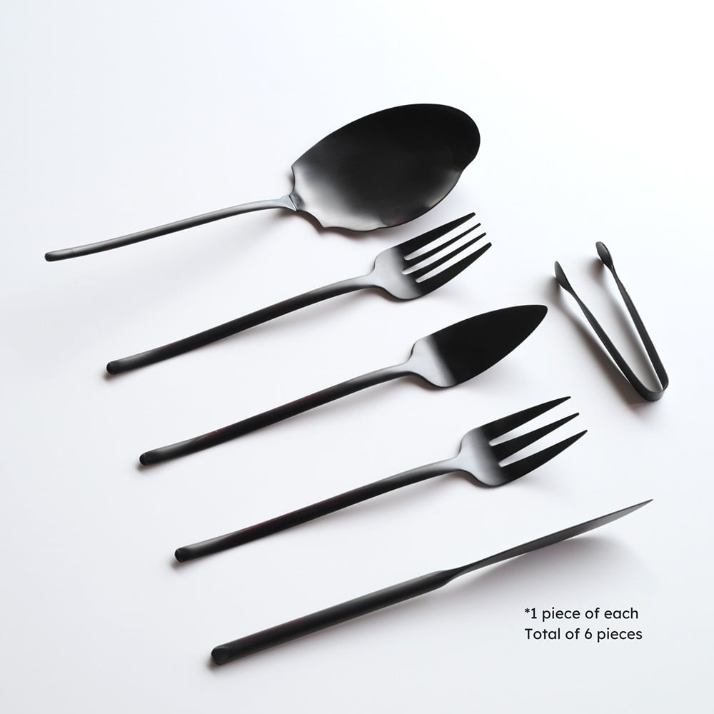 Set includes: meat carving knife, meat carving fork, fish carving knife, fish carving fork, rice serving spoon, sugar tong