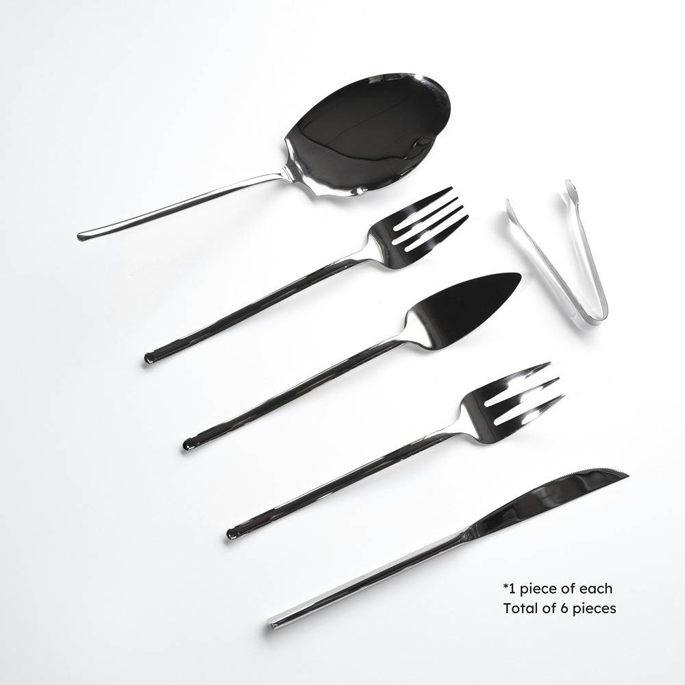 Set includes: meat carving knife, meat carving fork, fish carving knife, fish carving fork, rice serving spoon, sugar tong