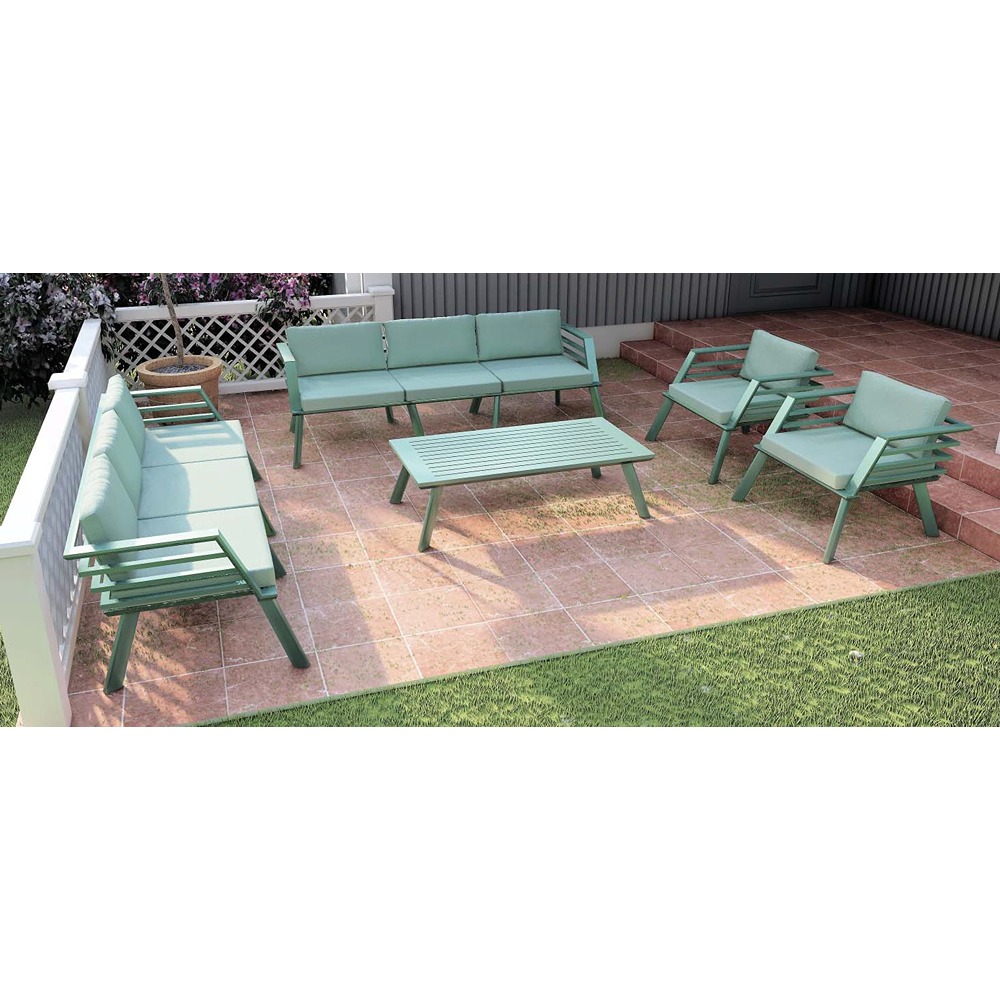 SKU: 70101FUR0222 Categories: Outdoor, Seating and Dining, Sofas & Sets Tags: 3+3+1+1+table, aluminium structure, China, Ff, green, green fabric, outdoor furniture Brand: Ff
