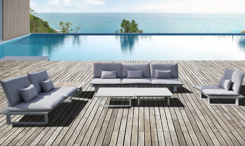 Sofas and Sets Ff; Ff;white;China;aluminium structure;3+2+1+table;outdoor furniture;gray fabric; Dimensions (3 seaters): Width: 249cm Depth: 83cm Height: 80cm;Dimensions (2 seaters): Width: 166cm Depth: 83cm Height: 80cm;Dimensions (1 seater): Width: 83cm Depth: 83cm Height: 80cm;Dimensions (coffee table): Width: 83cm Depth: 83cm Height: 30cm;